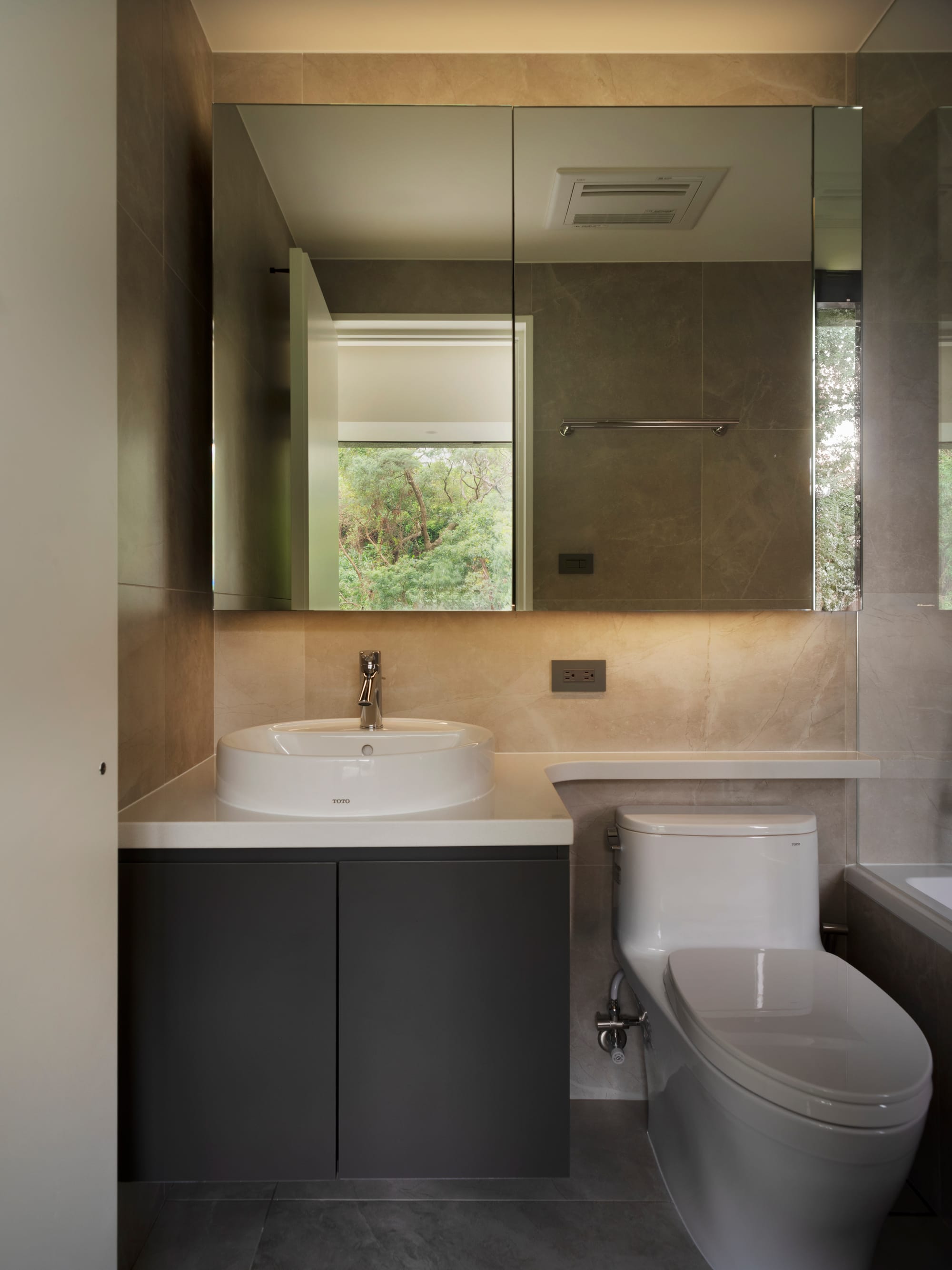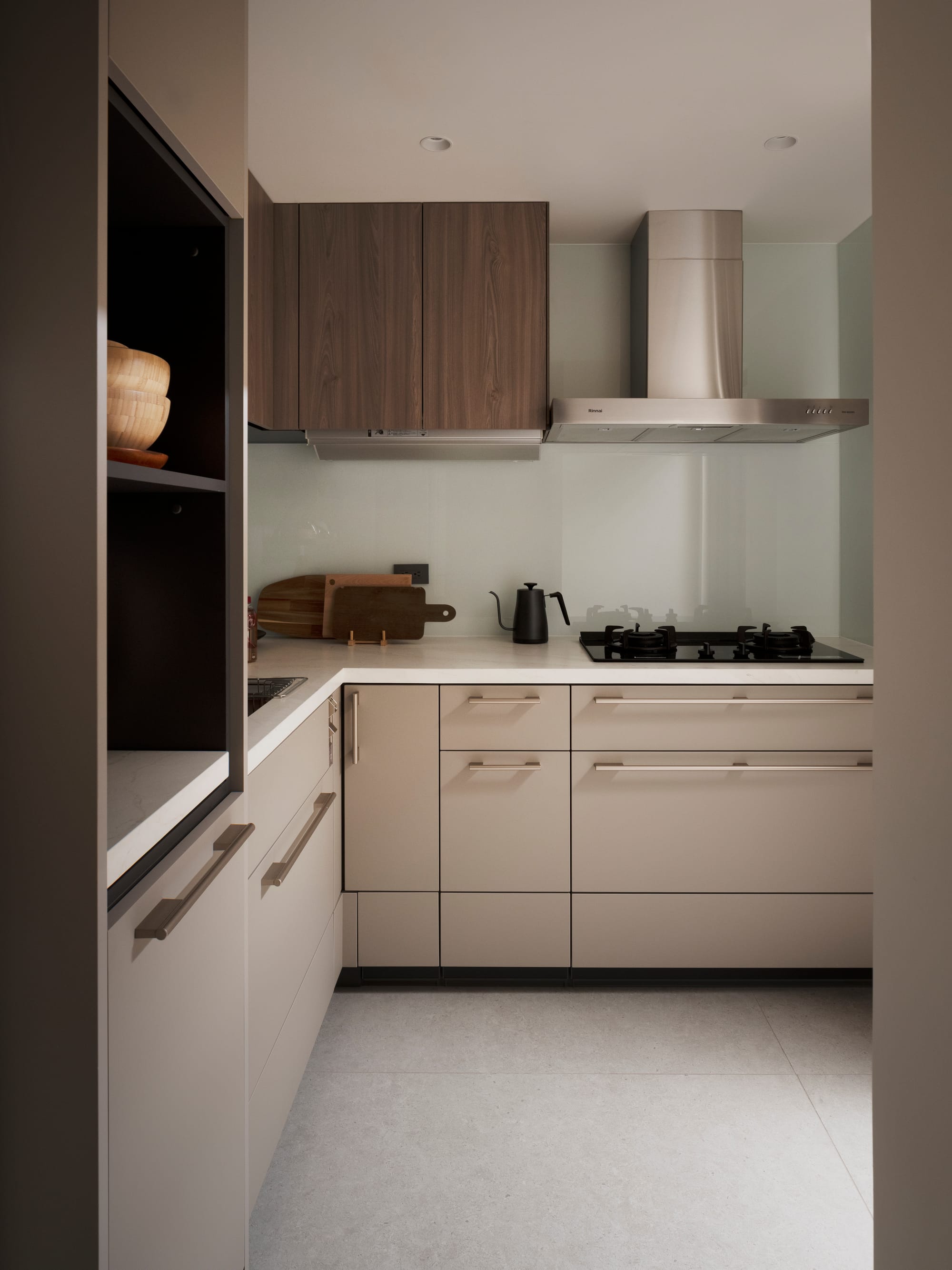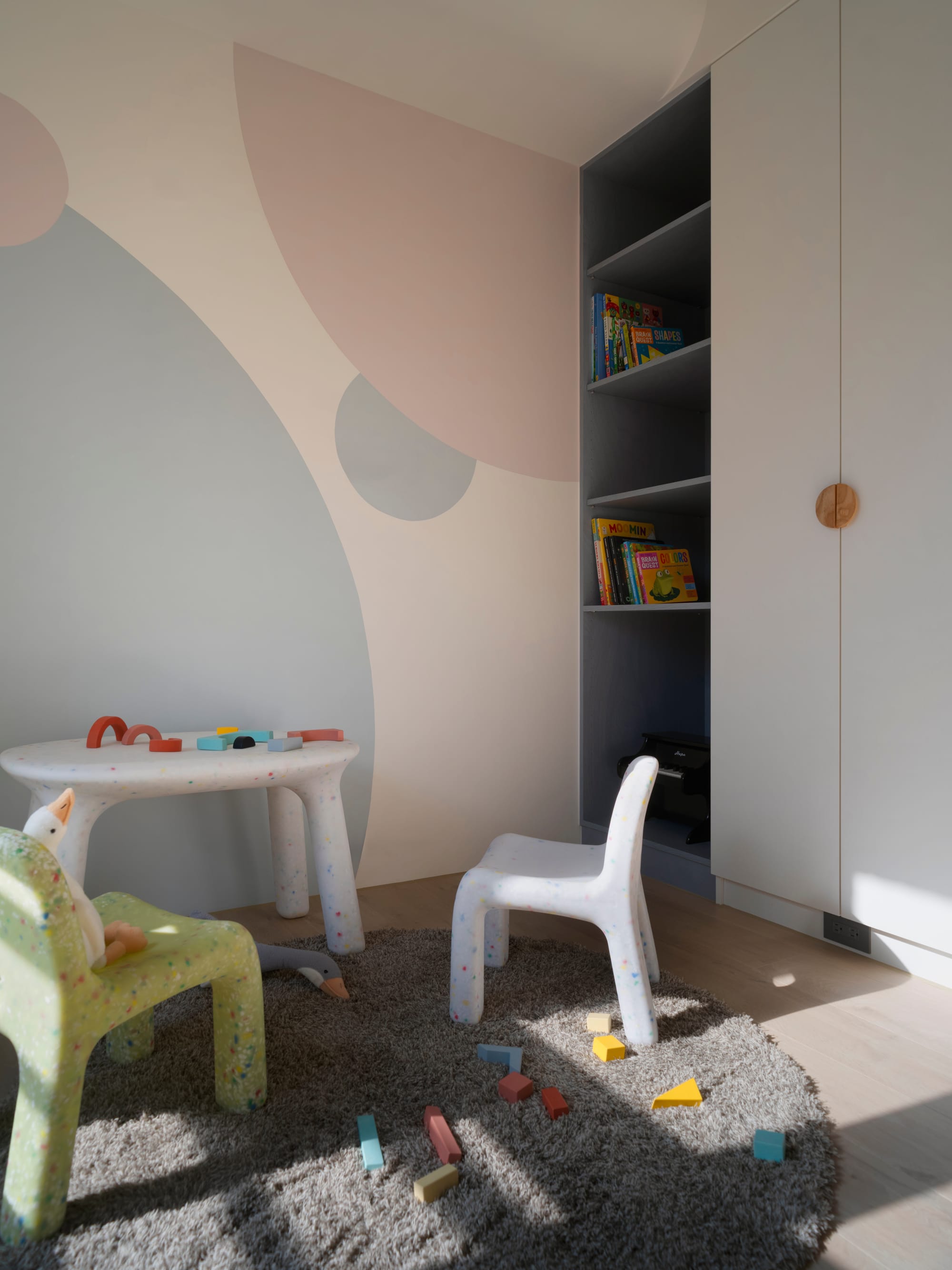 主臥室的大窗擁抱森林,將自然納入睡眠的一部分;兒童房以柔色幾何取代鮮豔,讓童趣不破壞整體的寧靜;廚房與衛浴以米灰、木紋與霧質面材延續整體語氣,使整個家宛如一段溫柔的篇章—澄淨、安穩、靜靜地擁抱生活發生的每一瞬。