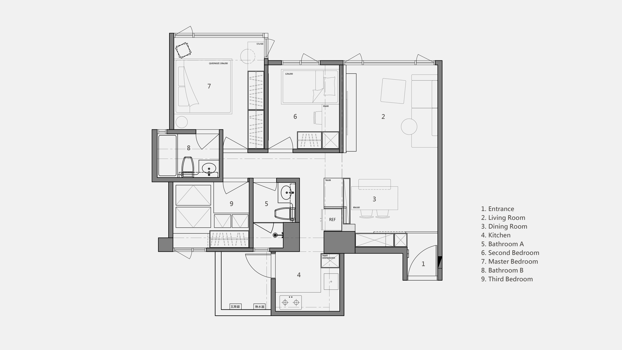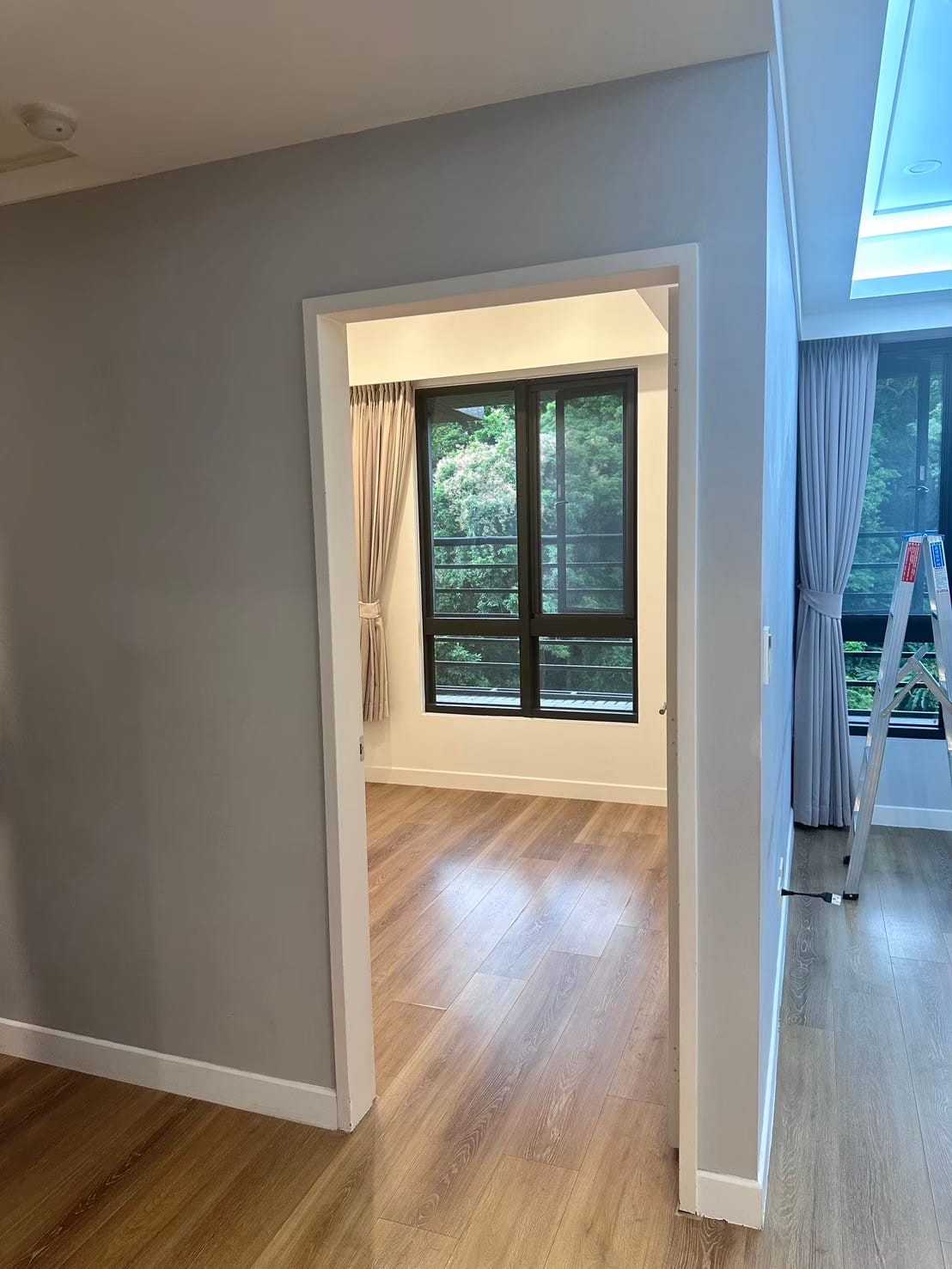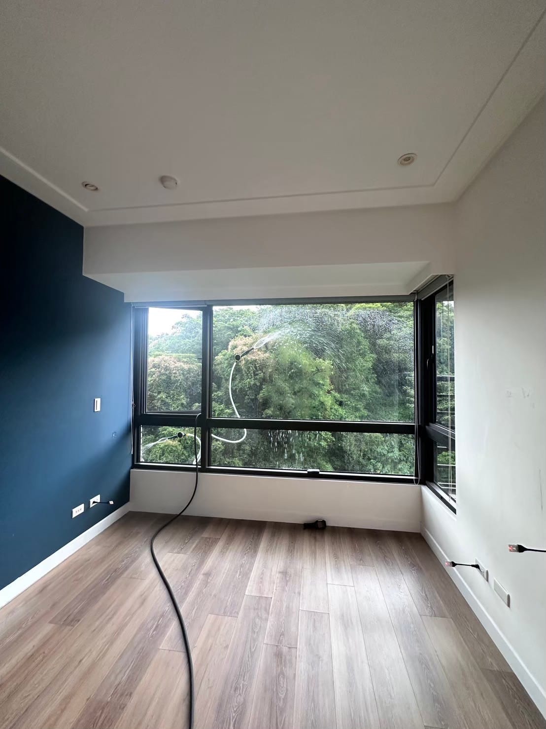 主臥室的大窗擁抱森林,將自然納入睡眠的一部分;兒童房以柔色幾何取代鮮豔,讓童趣不破壞整體的寧靜;廚房與衛浴以米灰、木紋與霧質面材延續整體語氣,使整個家宛如一段溫柔的篇章—澄淨、安穩、靜靜地擁抱生活發生的每一瞬。