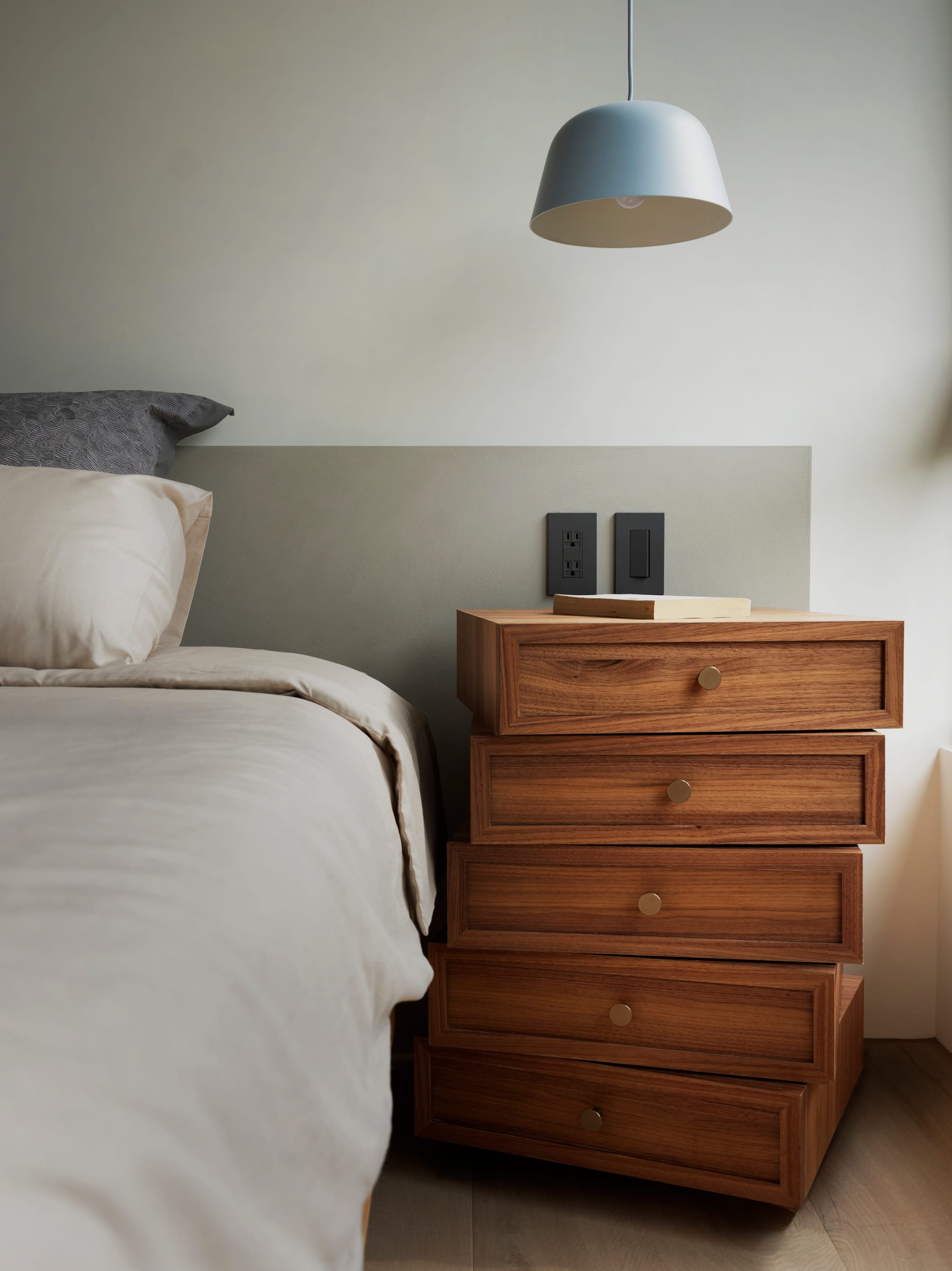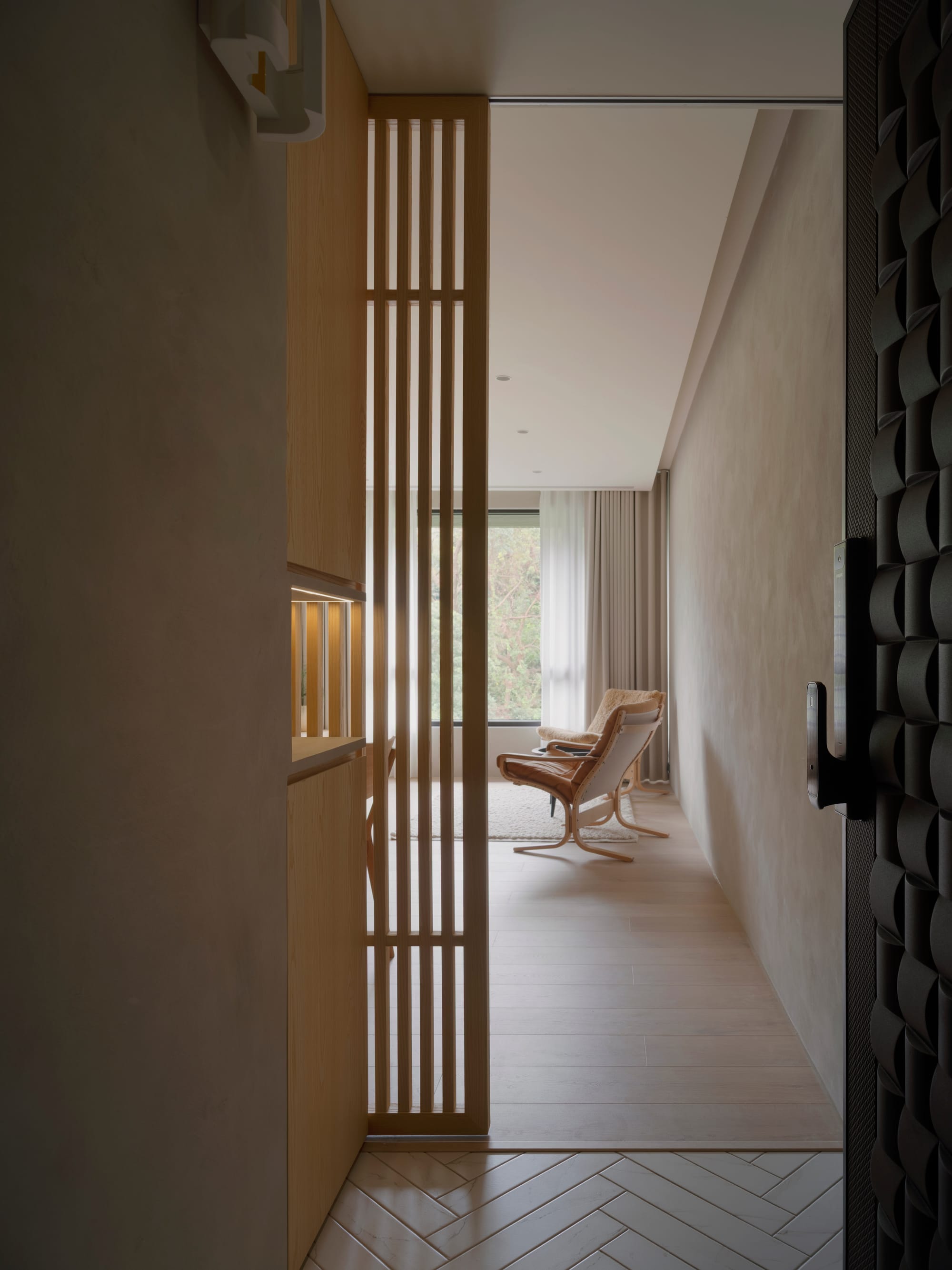 空間的語言以材質為核心。手作礦物塗料在光線下呈現細膩的霧面質感,木質地板與家具散發出溫度。格柵的筆直線條維持著秩序與節奏,也形成若隱若現的視覺層次,如同日本空間美學中的留白 ─ 不喧嘩,不爭取存在感,只安靜地陪伴著居住者的生活與心情。