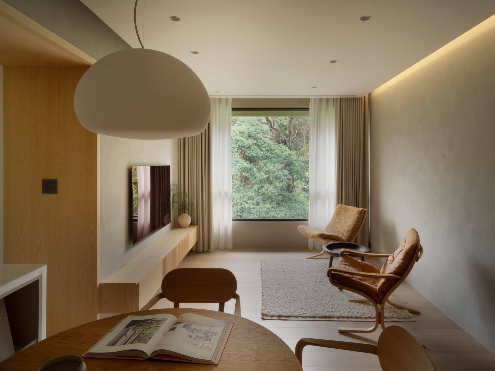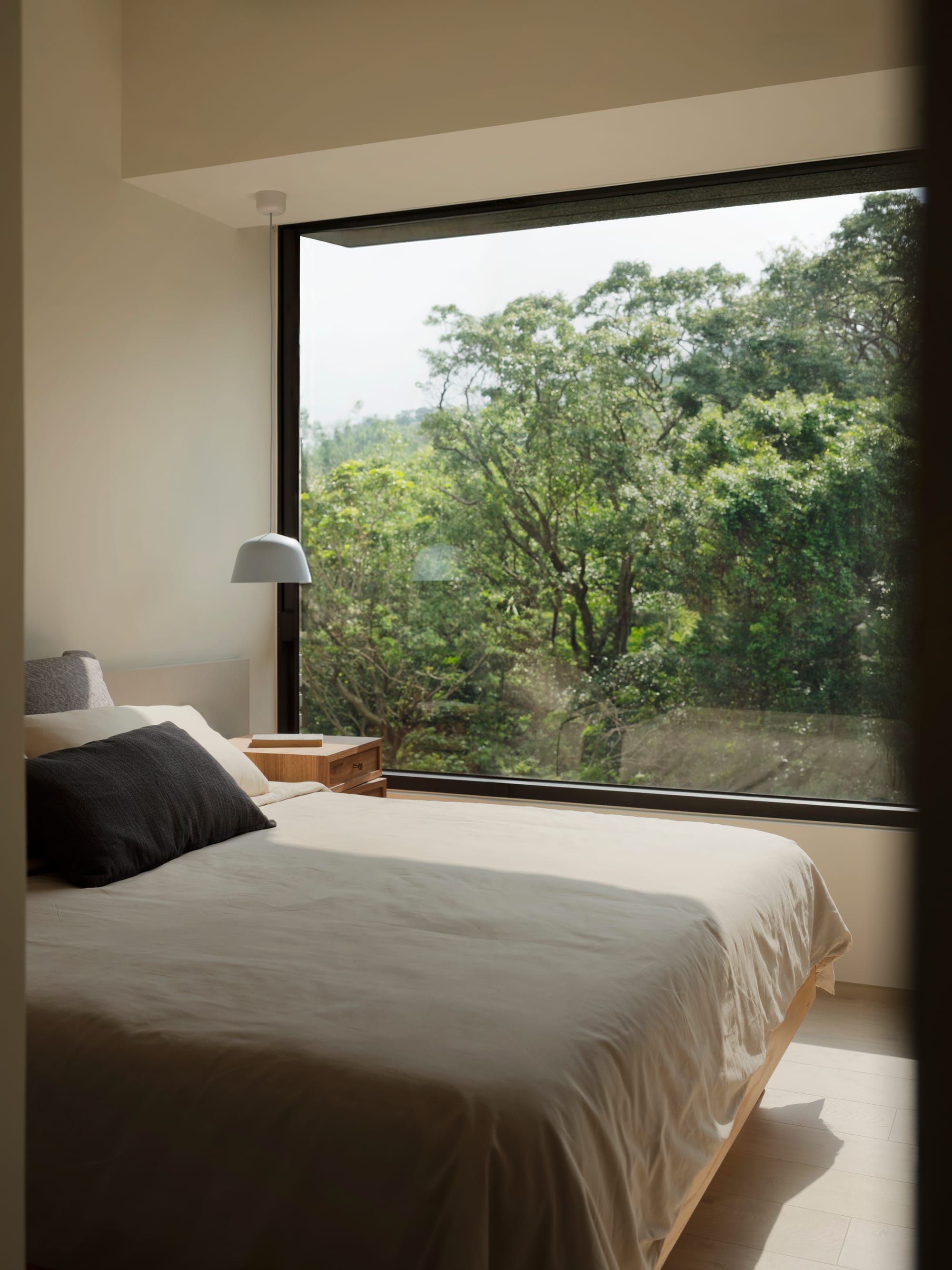 四季的光影在樹梢間流動,也在室內留下不經意的痕跡。我們選擇讓建築「退一步」,以柔霧灰與溫潤木色鋪展出一個足以容納大自然的靜謐框景。