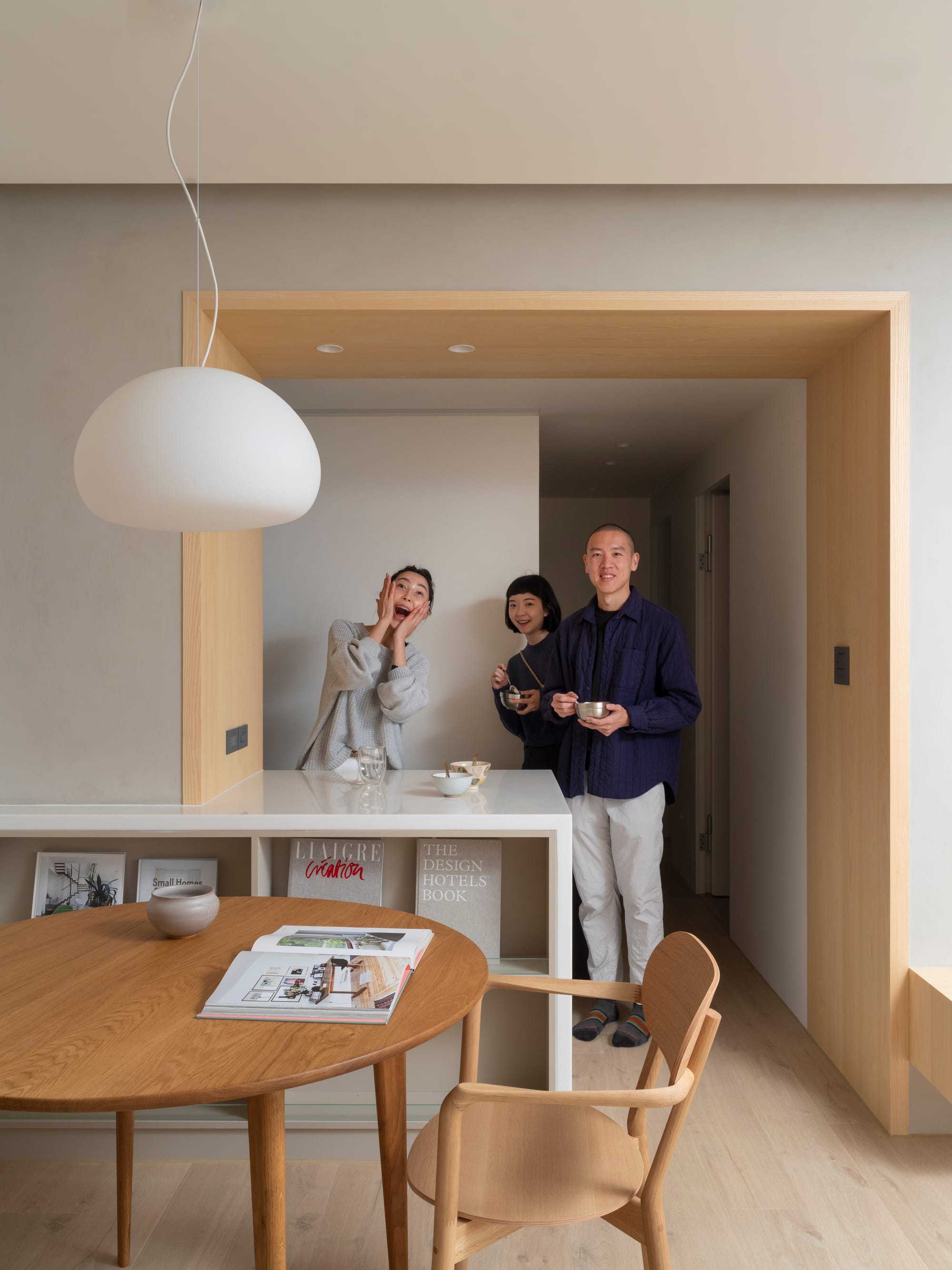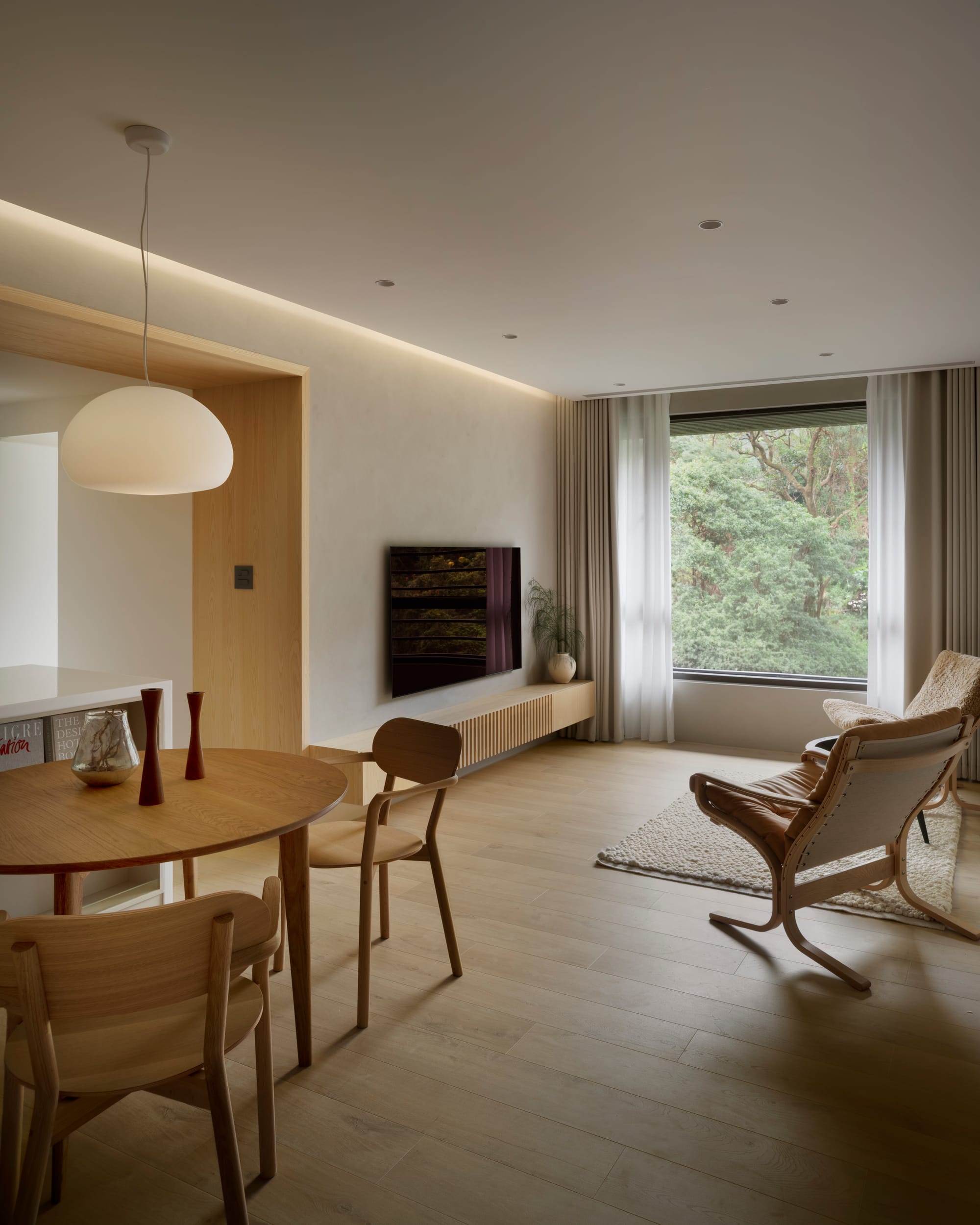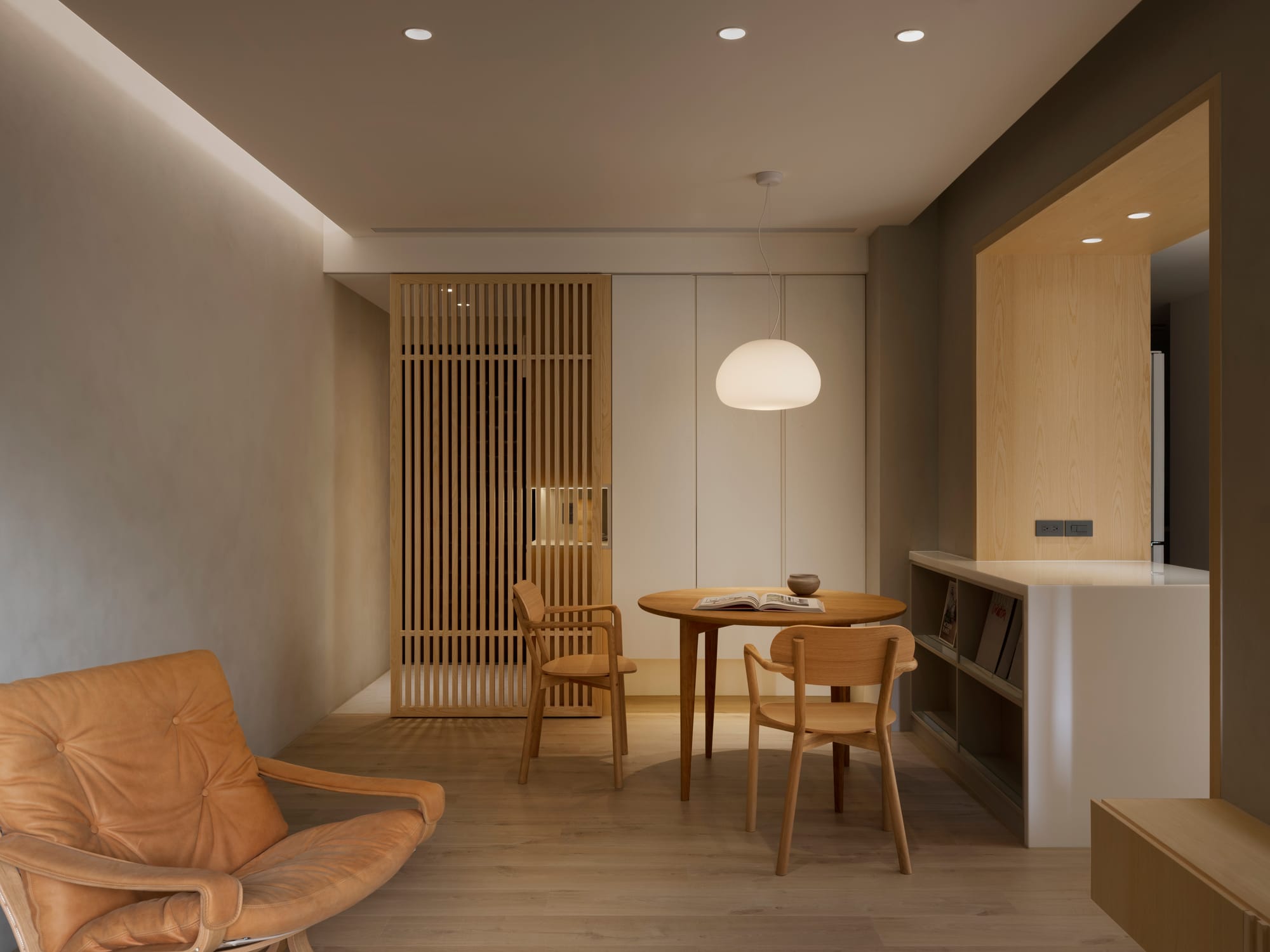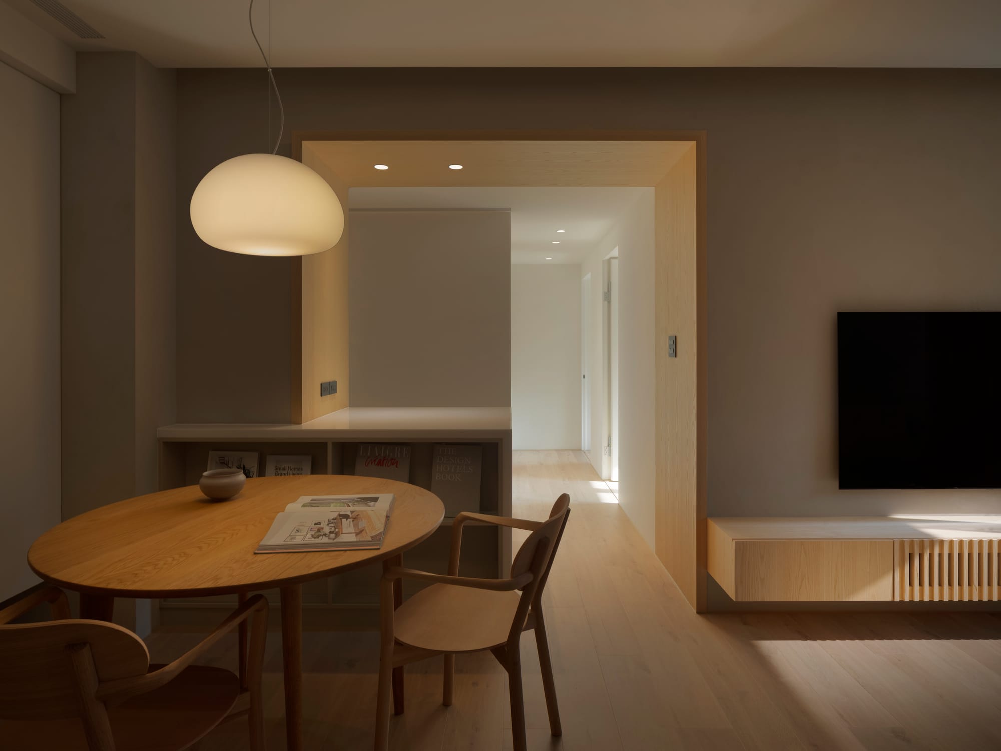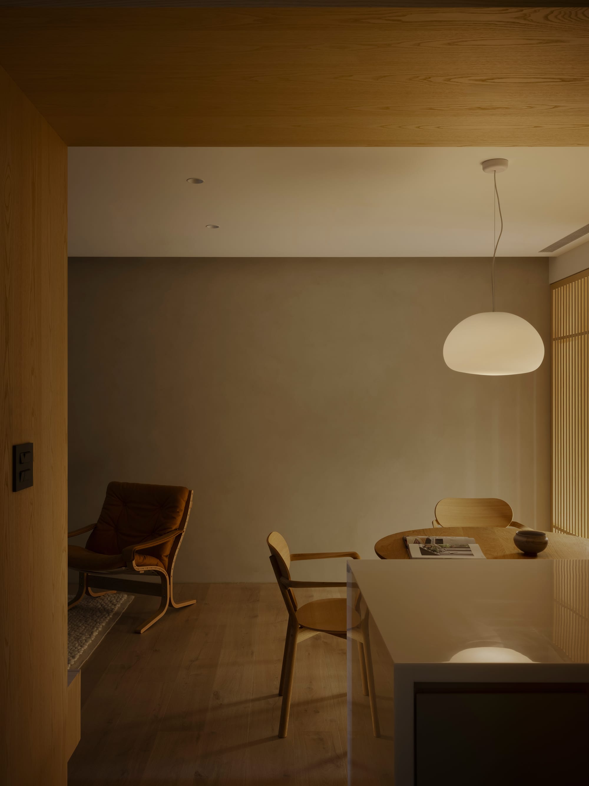 光線則成為本案最溫柔的語言。柔和的間接光沿著牆與天花漫開,像是對日常的一次深呼吸;餐桌上方的霧白燈罩沉靜地懸浮,為用餐與談話覆上一層安定的光膜。當光穿過格柵,在木紋與牆面之間留下細微陰影,空間像被輕輕喚醒,使空間更顯層次,彷彿時間被拉長。