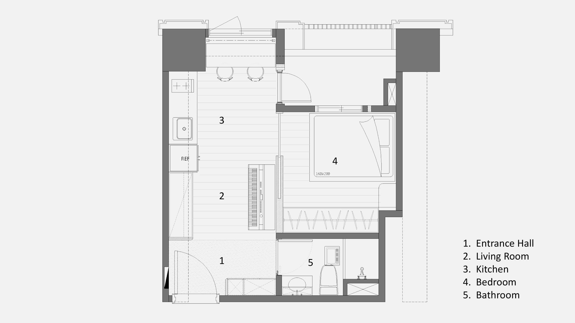 我們把視線導向窗邊,讓自然光成為空間的主角,機能被精準安放,線條簡化留下可呼吸的節奏,讓生活回到純粹。工作/閱讀桌落在採光面前,成為一日的節點,柔紗蜂巢簾調節光量,保有隱私與舒適度。利用一字型整列手法,展示層板、底櫃與廚具齊平延展,水平線條拉長視覺,消弭小宅的壓迫感。