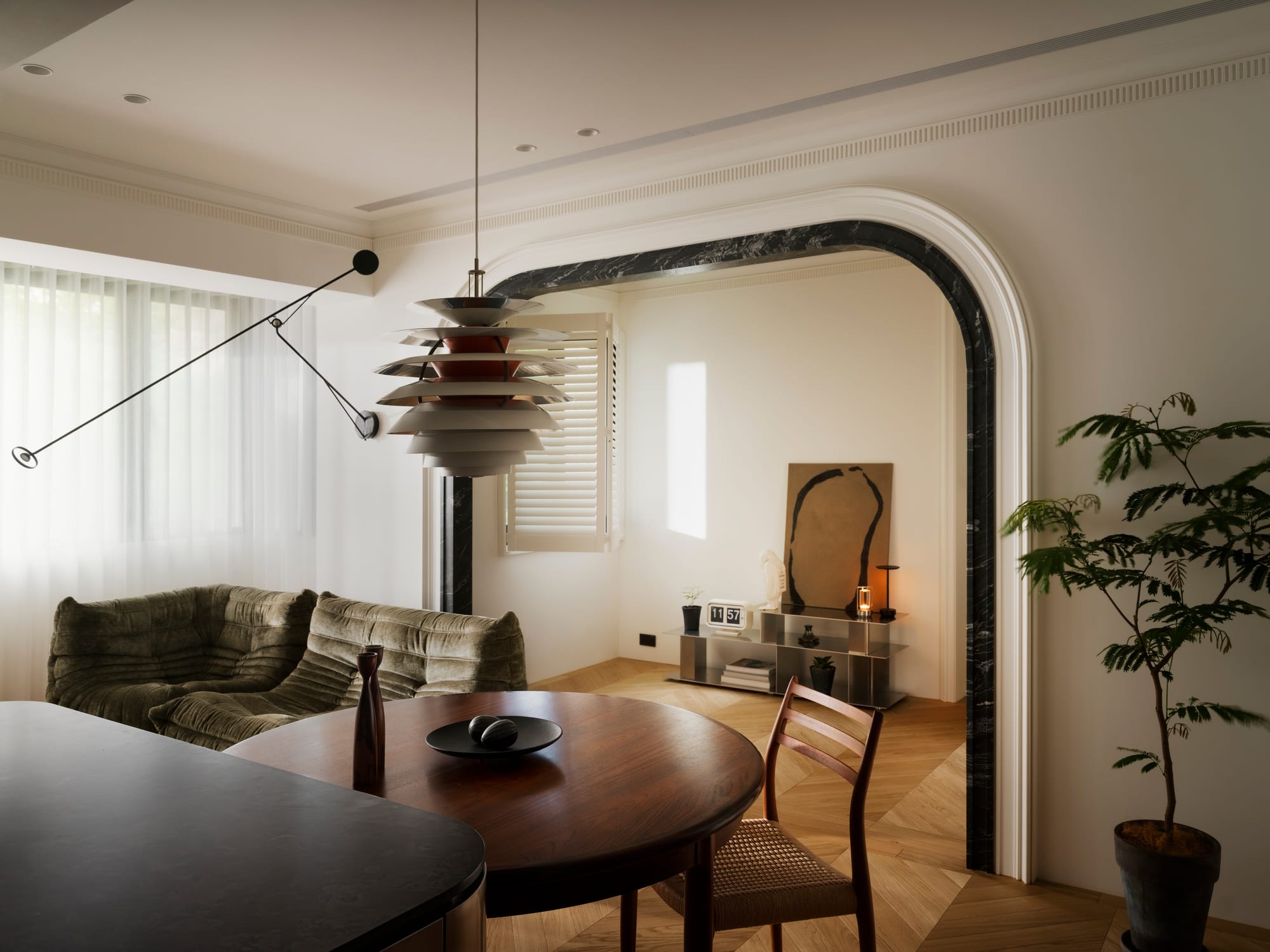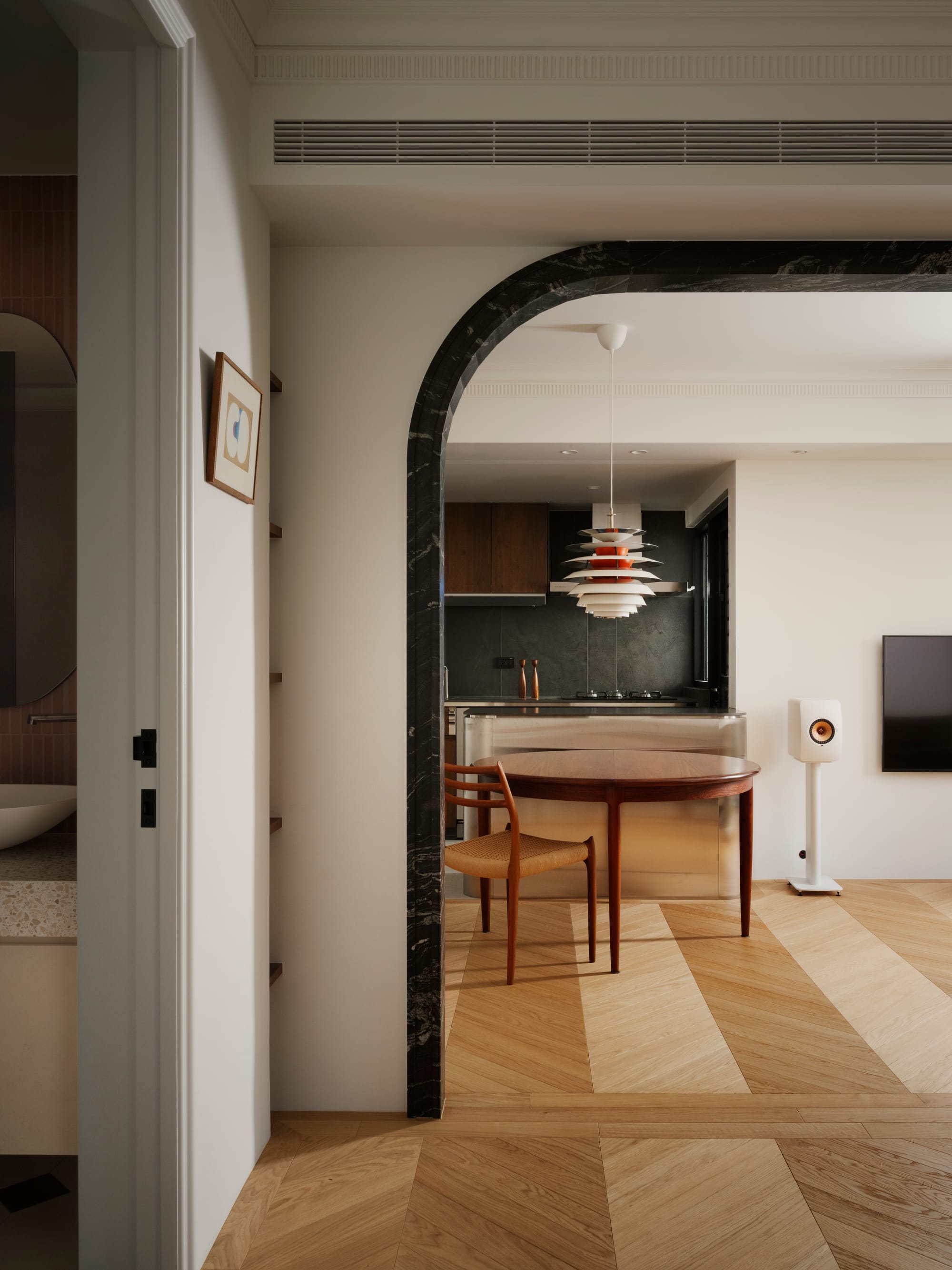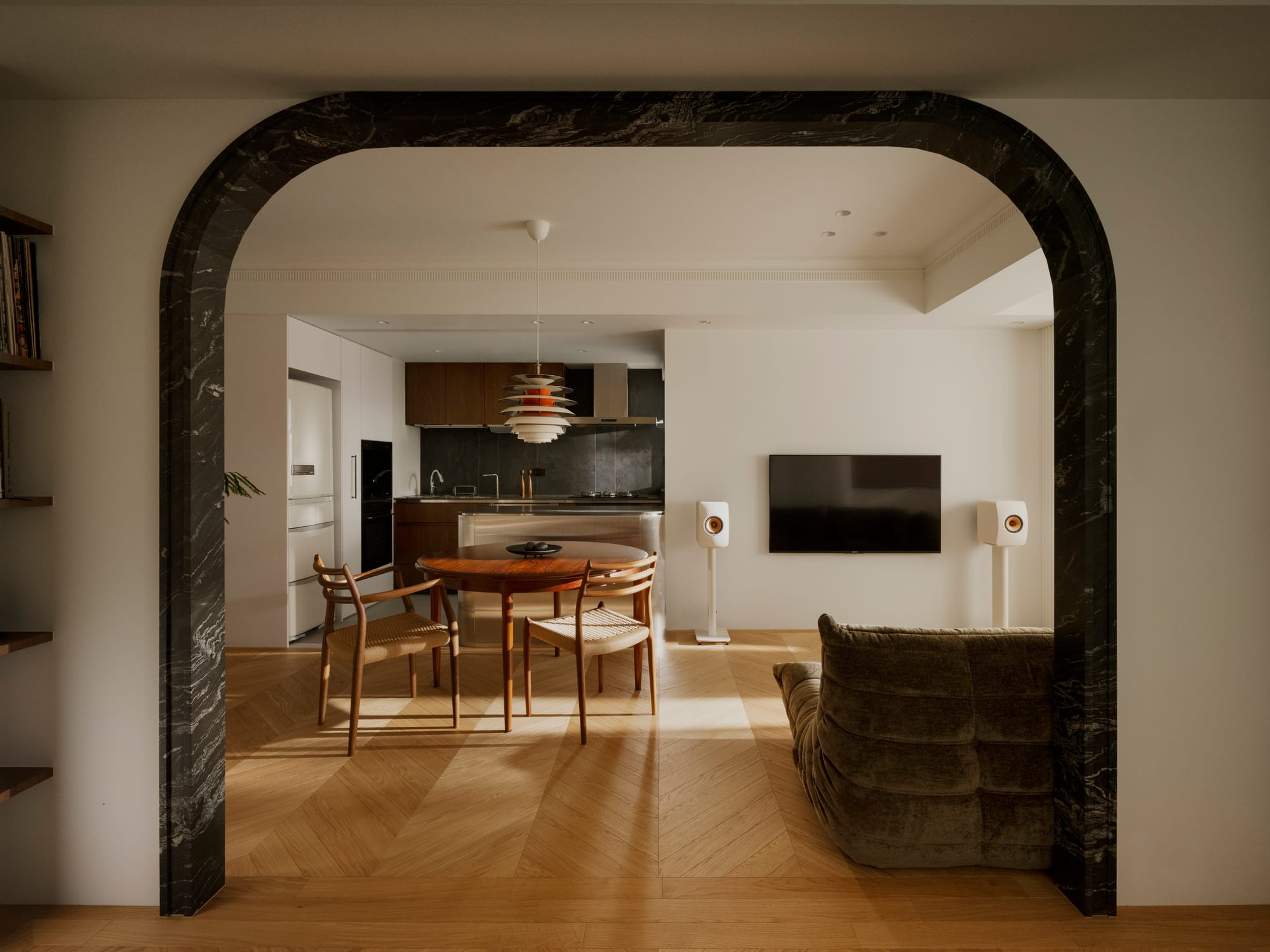 " This residence embodies a poetic dialogue between openness, materiality, and light. Conceived as a continuous life space rather than a series of rooms, it connects kitchen, dining, and living areas through fluid sightlines and sculptural marble thresholds. The project’s strength lies in its ability to balance modern sophistication with mid-century warmth. Every detail—from the brushed metal kitchen island to the dark-veined marble archways—serves as both function and form. The result is an atmosphere of quiet luxury that enhances everyday rituals and evokes timeless elegance. "
