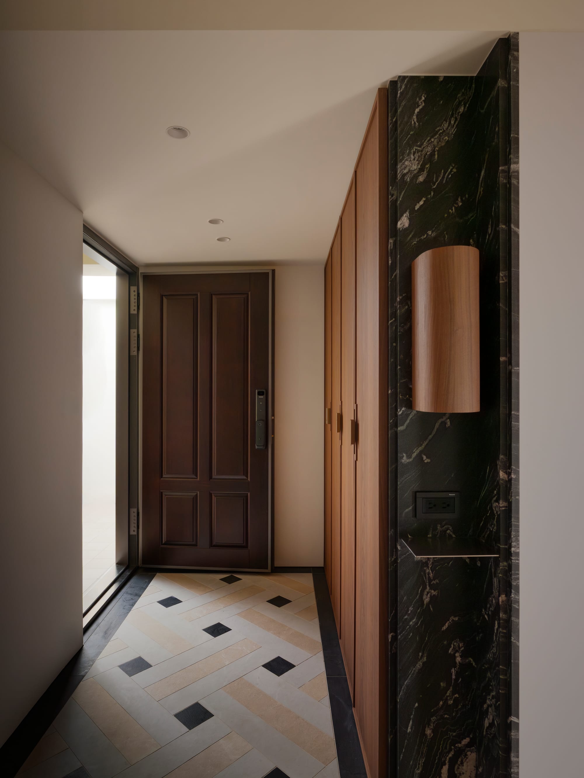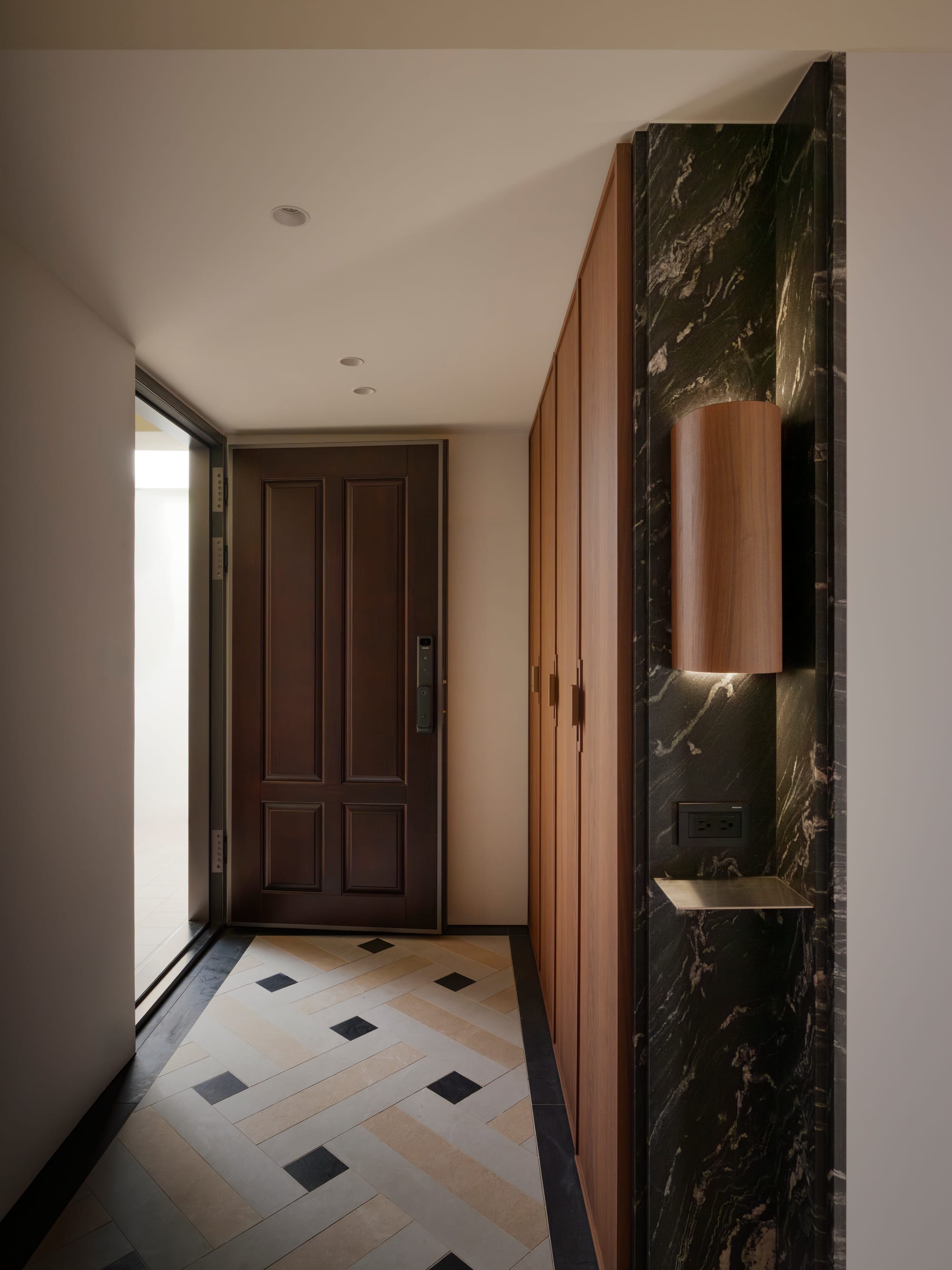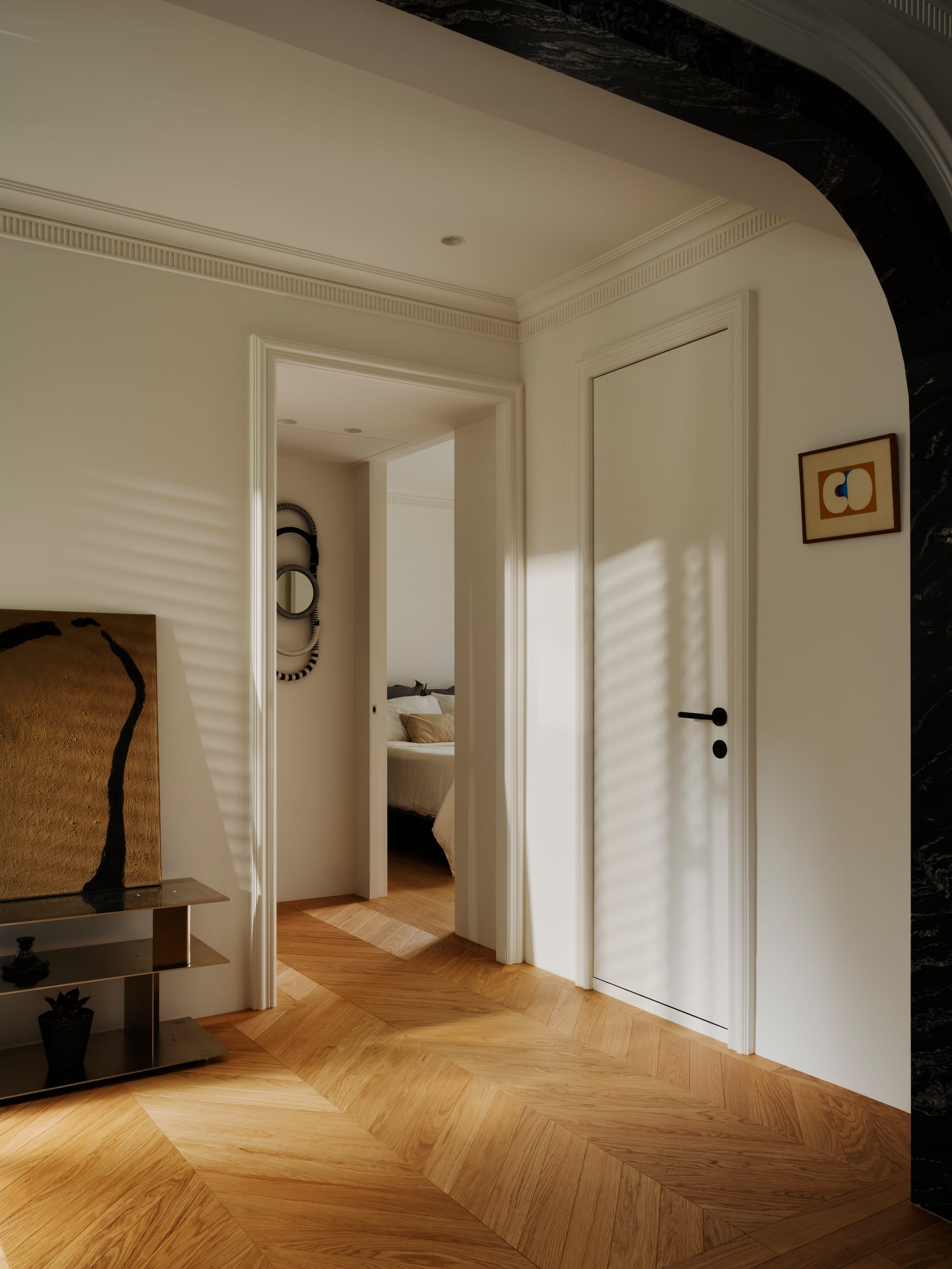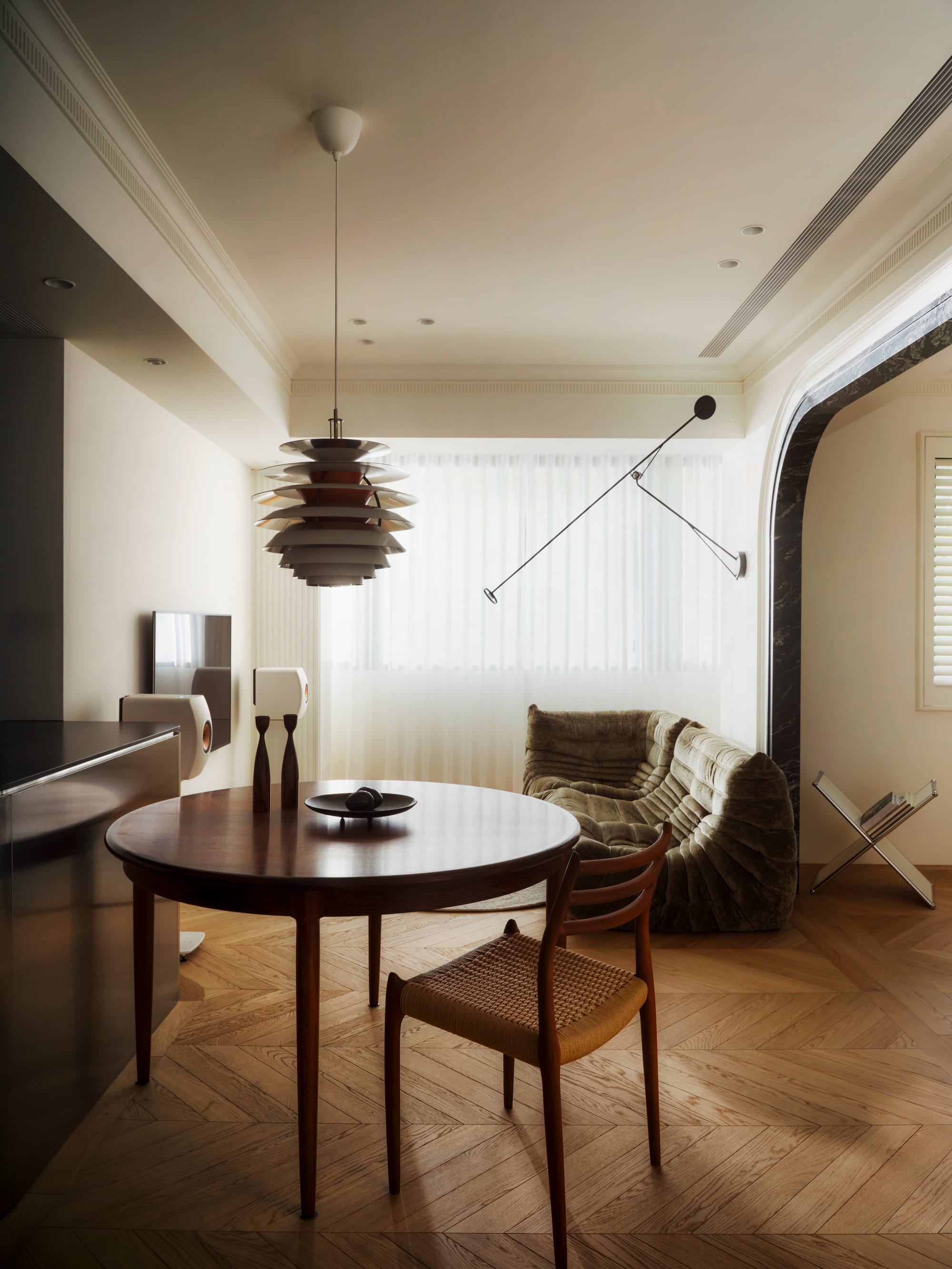 " This residence embodies a poetic dialogue between openness, materiality, and light. Conceived as a continuous life space rather than a series of rooms, it connects kitchen, dining, and living areas through fluid sightlines and sculptural marble thresholds. The project’s strength lies in its ability to balance modern sophistication with mid-century warmth. Every detail—from the brushed metal kitchen island to the dark-veined marble archways—serves as both function and form. The result is an atmosphere of quiet luxury that enhances everyday rituals and evokes timeless elegance. "