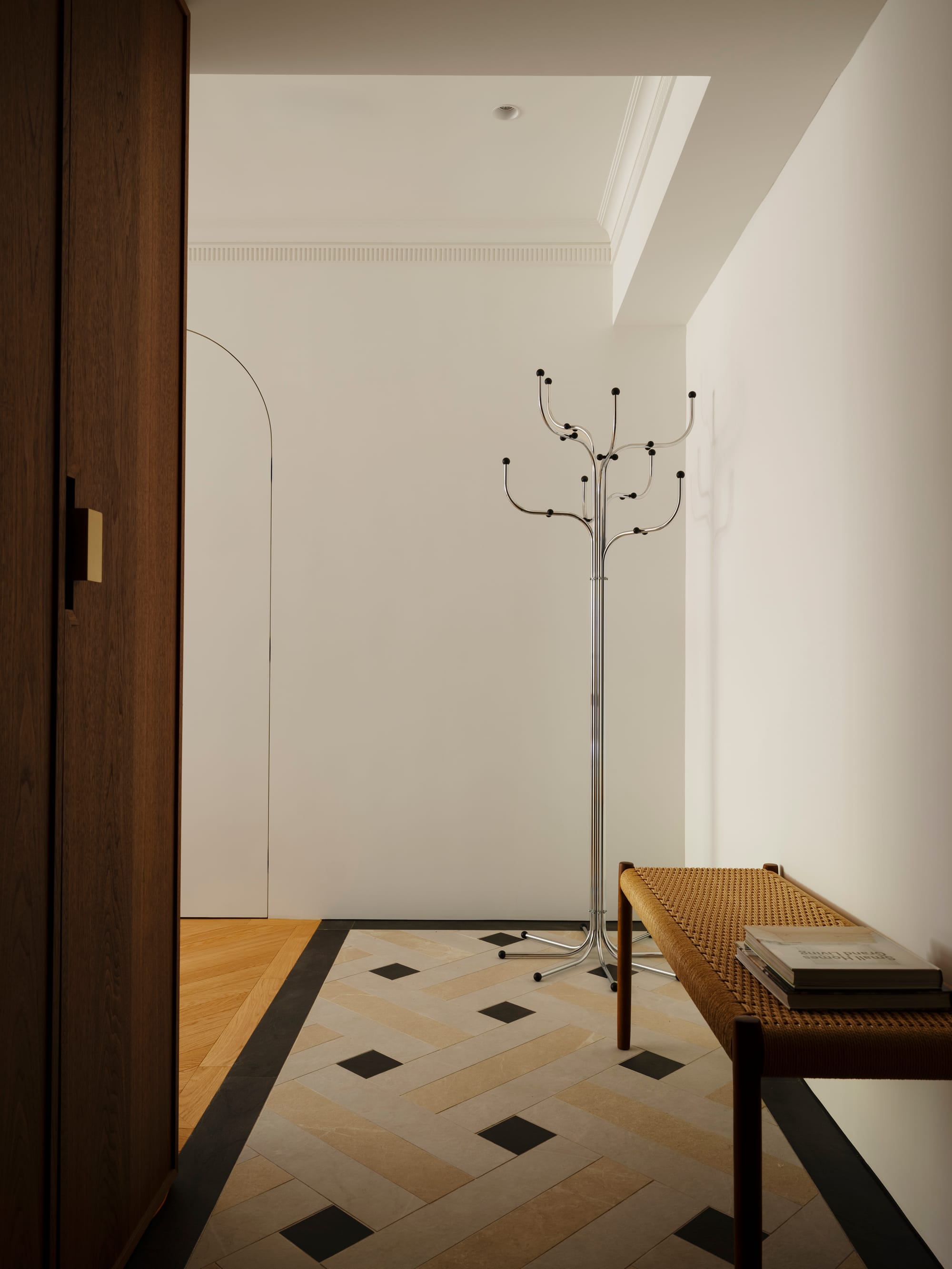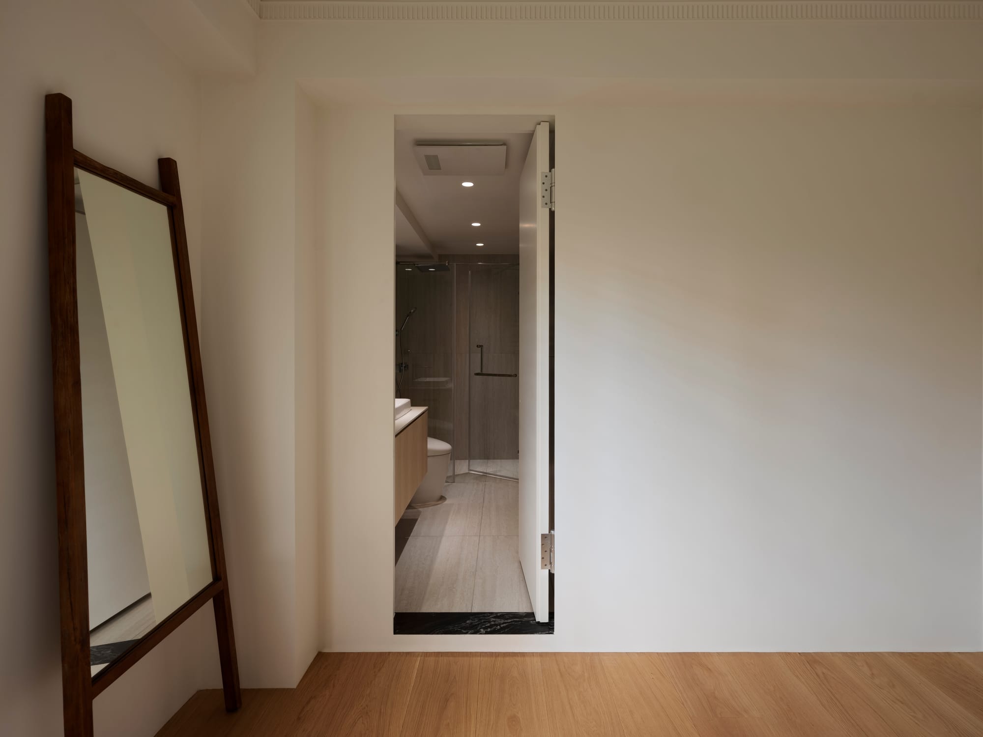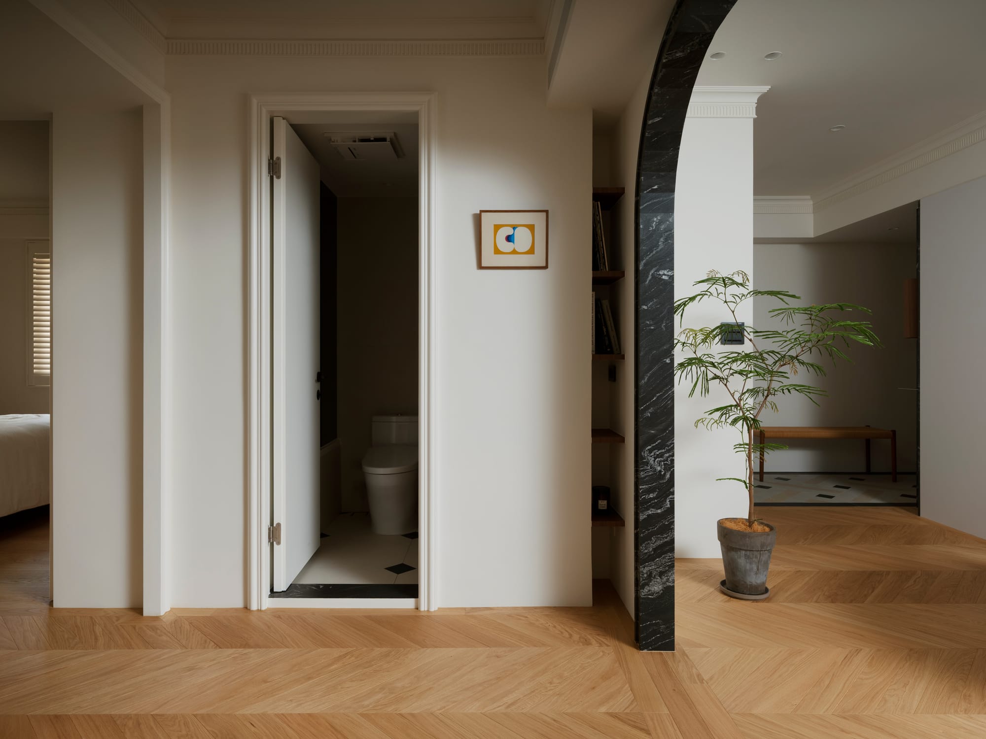 本案以緊湊的都市住宅為背景,思考如何在有限尺度中創造平靜而連續的生活體驗。並未單純追求空間的開放,而是透過一樘「型構的拱門」,讓光線、動線與日常行為在不同區域之間自然運行,構築出有節奏的空間關係。