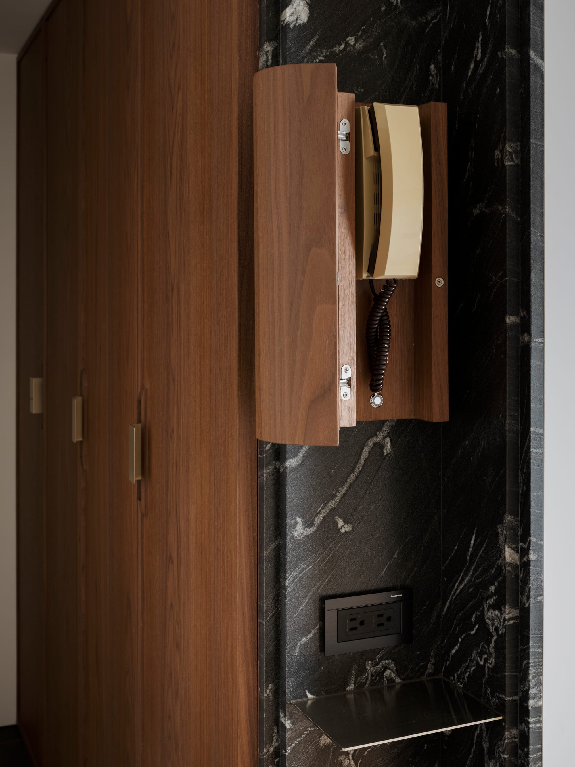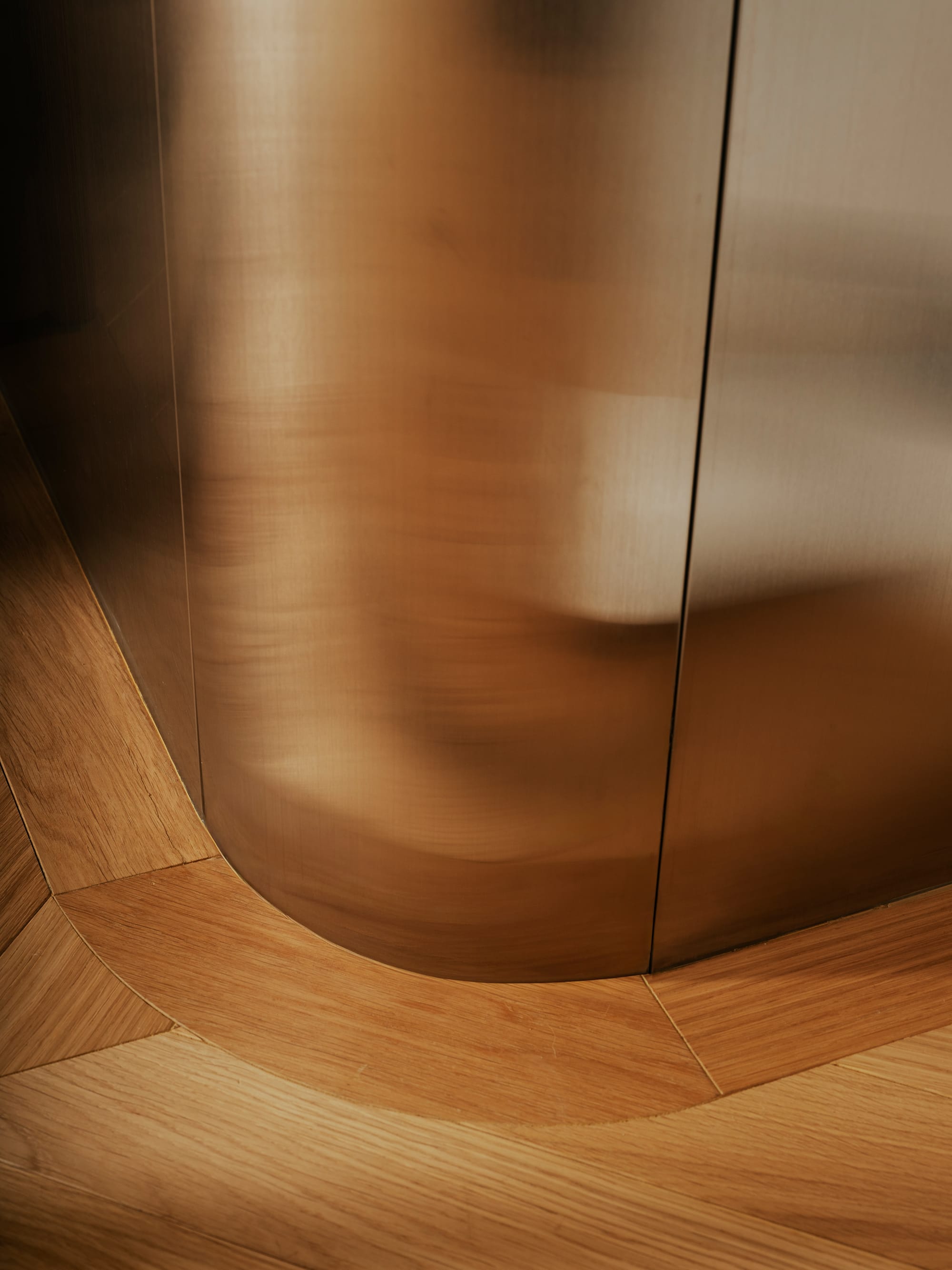 公共生活區以鋼構弧面中島作為核心,串聯廚房、用餐與起居活動。金屬表面回應自然光線,柔化空間層次。整體機能被整合於建築語彙之中,包括清晰的循環路徑、隱藏式收納、以及不受阻礙的自然採光,透過設計語彙融入空間,例如訂製胡桃木壁燈整合原有通訊系統,將限制轉化為空間細節。